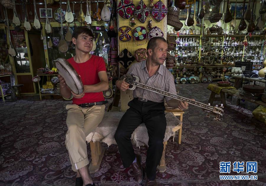 喀什古城景区“老城艾山玉山手工木器艺术品展览店”店主玉买尔江·玉山(左)和工作人员为顾客展示民族乐器(7月6日摄)。 新华社记者 赵戈 摄