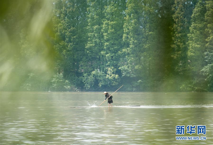 7月11日,方恕云站在一根毛竹上横渡新安江。 54岁的浙江建德农民方恕云,自少年时就开始练习站在一根毛竹上渡江的绝技,还能做俯卧撑、抬脚跳等动作,在水中“如履平地”。 新华社记者 翁忻旸 摄