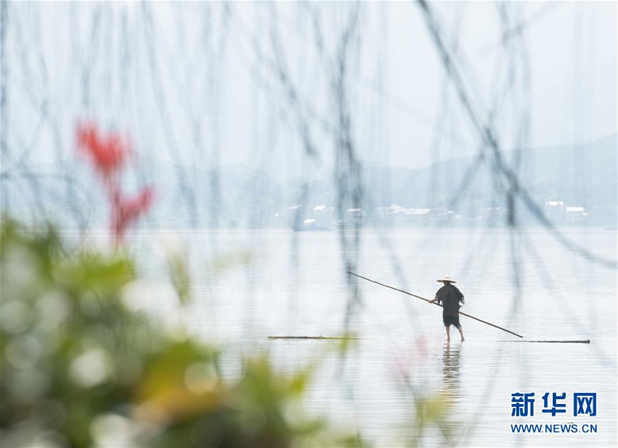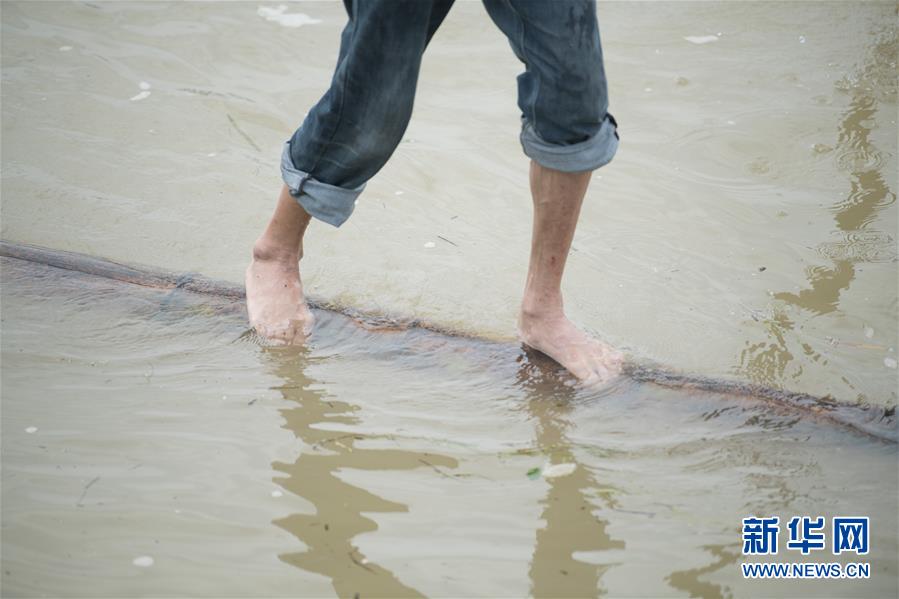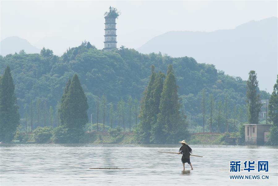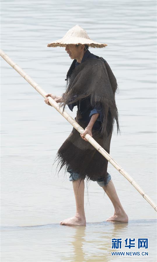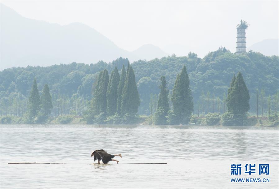 7月11日,方恕云站在一根毛竹上横渡新安江。 54岁的浙江建德农民方恕云,自少年时就开始练习站在一根毛竹上渡江的绝技,还能做俯卧撑、抬脚跳等动作,在水中“如履平地”。 新华社记者 翁忻旸 摄