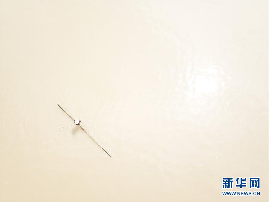7月11日,方恕云站在一根毛竹上横渡新安江(无人机拍摄)。 新华社记者 翁忻旸 摄