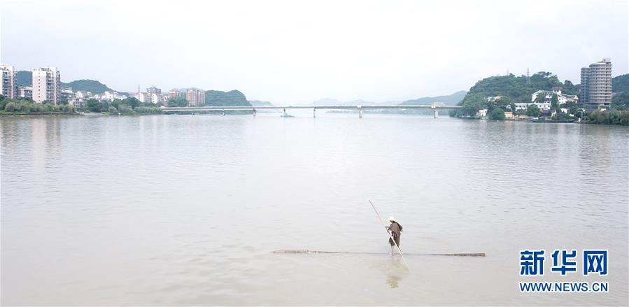 7月11日,方恕云站在一根毛竹上横渡新安江。 新华社记者 翁忻旸 摄