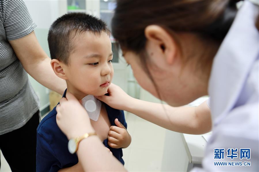 7月12日,一名儿童在宁夏医科大学附属中医医院贴敷。 当日是初伏的第一天,也是传统中医“冬病夏治”的最佳时机。各地不少群众前往医疗卫生服务机构,贴三伏贴、针灸、艾灸,以增强身体抗病能力,达到防治疾病的目的。 新华社记者 唐亚蒙 摄