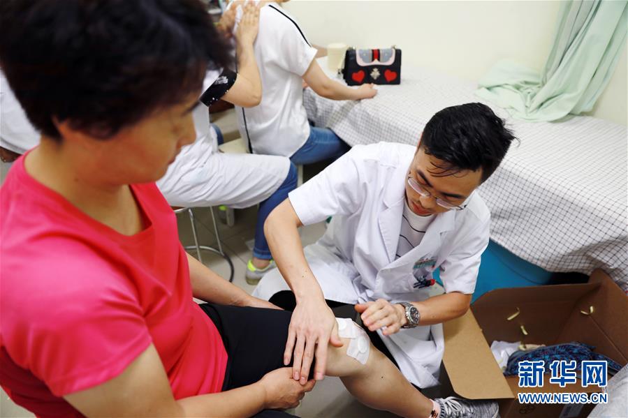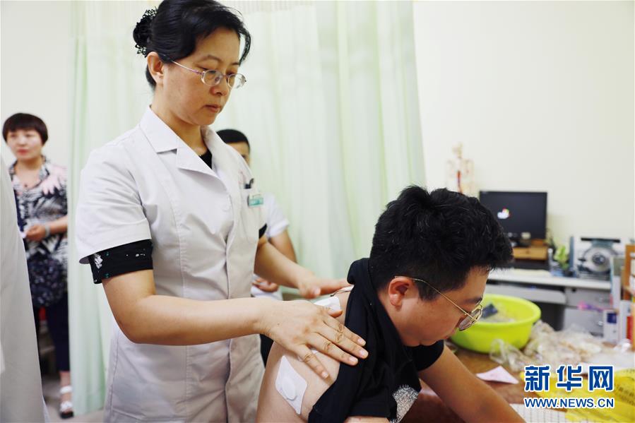 7月12日,在河北邢台经济开发区金宏社区,医务人员为市民进行艾灸和贴敷治疗。 当日是初伏的第一天,也是传统中医“冬病夏治”的最佳时机。各地不少群众前往医疗卫生服务机构,贴三伏贴、针灸、艾灸,以增强身体抗病能力,达到防治疾病的目的。 新华社记者 邢广利 摄