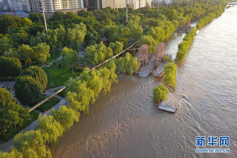 7月13日,黄河兰州段沿岸的兰州水车博览园内部分设施被淹(无人机拍摄)。 新华社记者 范培珅 摄