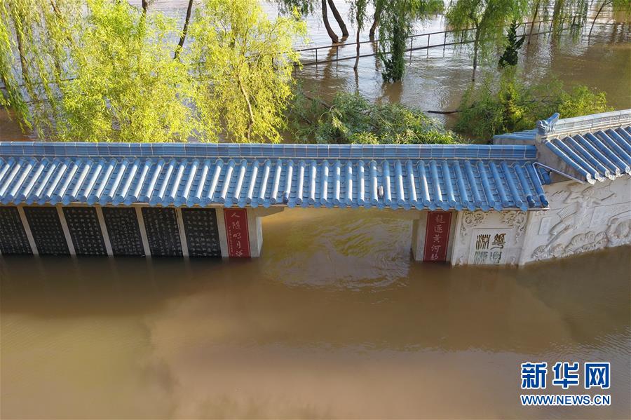 7月13日,黄河兰州段沿岸的兰州龙源公园部分设施被淹没(无人机拍摄)。 新华社记者 范培珅 摄