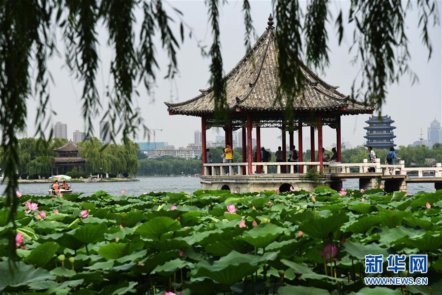7月14日,游客在济南大明湖欣赏荷花。新华社记者王凯摄