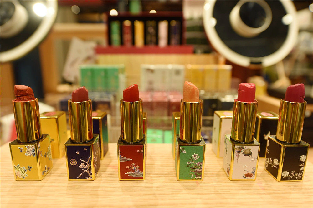 2019年7月14日,顾客在杭州一家商场选购“故宫口红”。近日,由故宫博物院推出的彩妆文创产品“故宫口红”现身杭州一家商场,让人们不用在网上进行抢购同时,还能在购买现场进行亲身体验,颇受年轻顾客的欢迎。龙巍/视觉中国