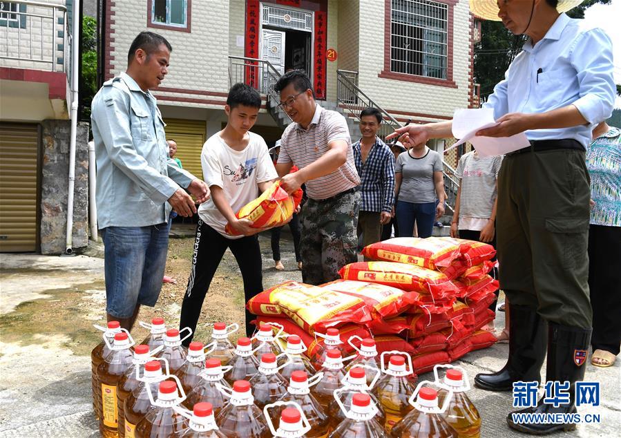 7月16日,广西河池市东兰县隘洞镇坡拉村高更屯村民在领取救灾物资。7月以来,广西河池市东兰县遭受两次强降雨袭击,全县14个乡镇均不同程度受灾。受强降雨影响,东兰县隘洞镇坡拉村高更屯被洪水围困,成为“孤岛”。7月16日,隘洞镇民兵应急分队经过陆路、水路到达坡拉村高更屯,手提肩扛为被洪水围困的群众送去救援物资。新华社记者周华摄