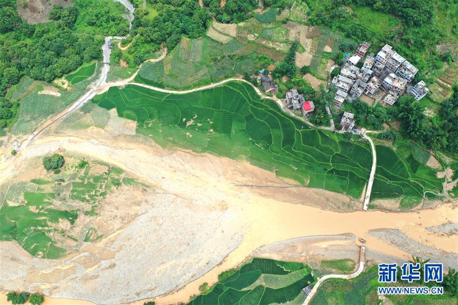 广西河池市东兰县隘洞镇坡拉村高更屯两条通屯道路均被洪水冲毁(7月16日无人机拍摄)。7月以来,广西河池市东兰县遭受两次强降雨袭击,全县14个乡镇均不同程度受灾。受强降雨影响,东兰县隘洞镇坡拉村高更屯被洪水围困,成为“孤岛”。7月16日,隘洞镇民兵应急分队经过陆路、水路到达坡拉村高更屯,手提肩扛为被洪水围困的群众送去救援物资。新华社记者周华摄
