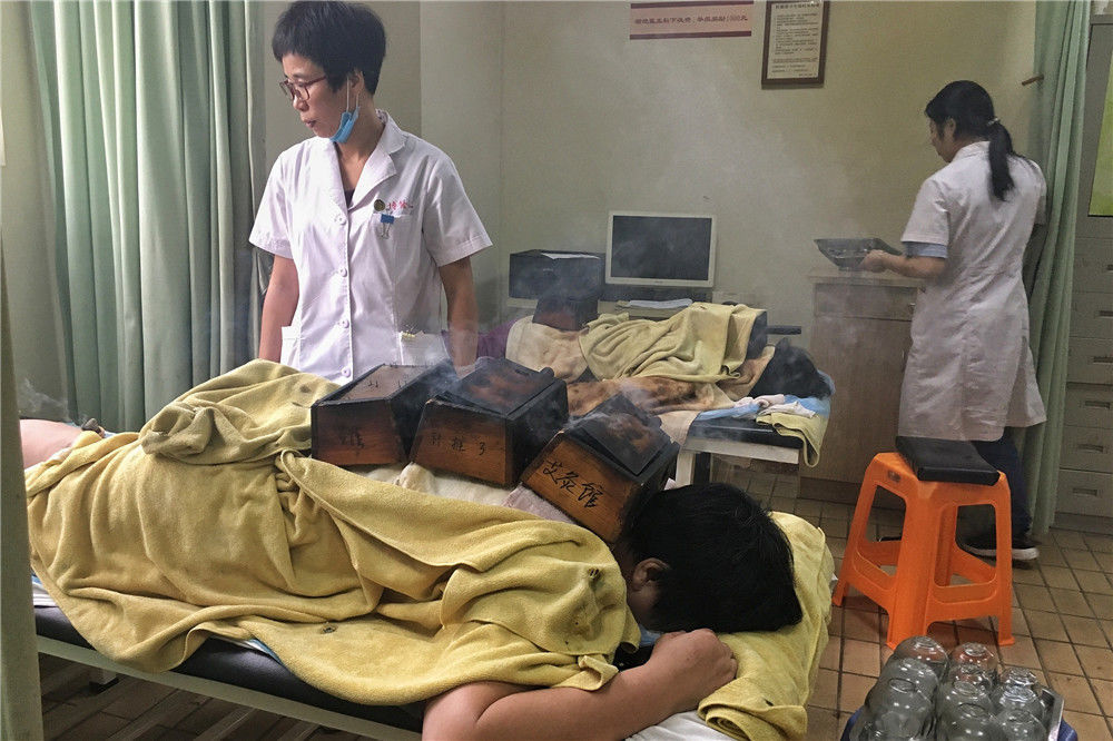 2018年7月7日,福州,一家中医药馆在帮顾客进行三伏灸治疗。今天是小暑节气,一年一度三伏灸的付前灸正式登场亮相。sinar/视觉中国