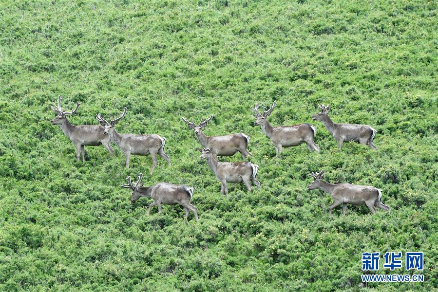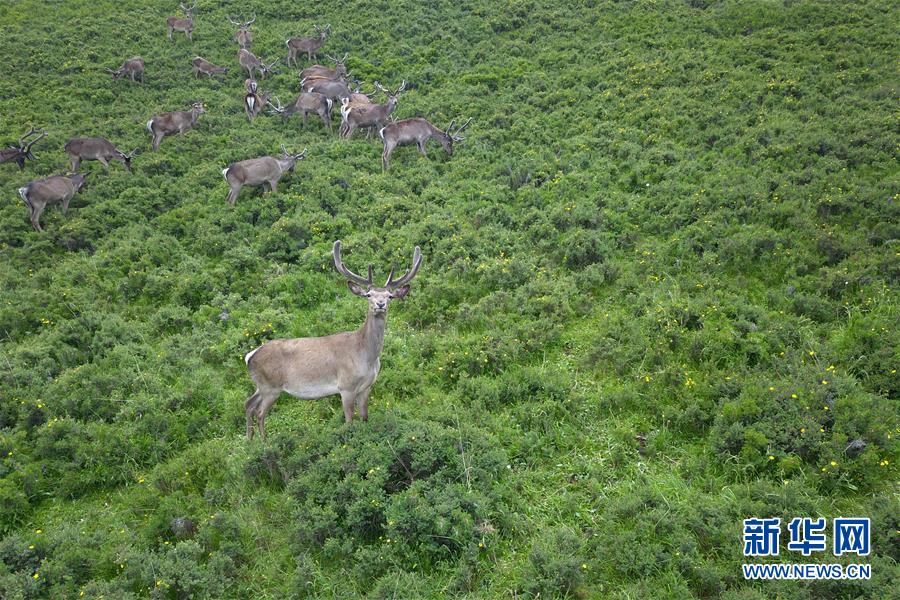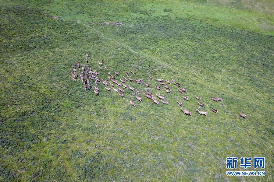 这是在肃南裕固族自治县大河乡境内的草原上拍摄的马鹿(7月20日无人机拍摄)。新华社记者范培珅摄