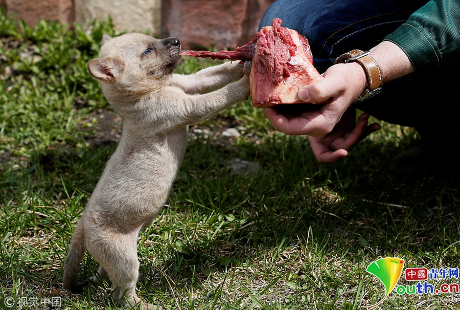 当地时间2018年5月11日,俄罗斯克拉斯诺雅茨克,当地动物园饲养员给一只1月大的印度野狗Gelya喂食。