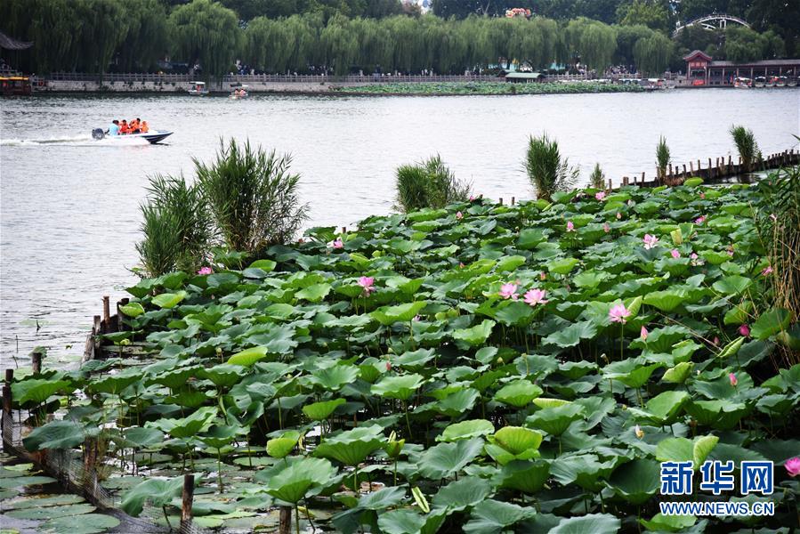 7月14日,游客在大明湖乘坐快艇经过一片荷花池。新华社记者王凯摄
