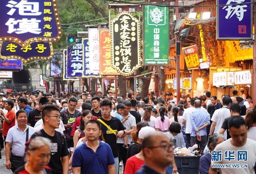 7月19日,游客在西安回民街上游览。暑期以来,西安市各大旅游景点人气火爆。大量游客前来游览历史文化景区,品尝传统特色美食,感受千年古都厚重与时尚交融的独特魅力。新华社记者邵瑞摄