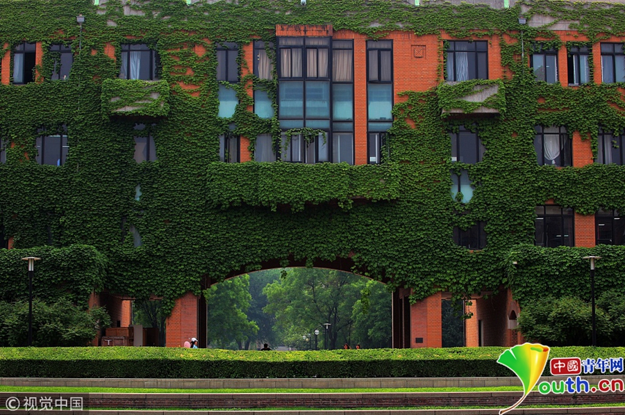 2018年5月10日,北京。在清华校园内教学楼、办公楼等多处建筑物上被爬山虎攀爬扮绿,呈现一派绿装素裹自然美丽景观。