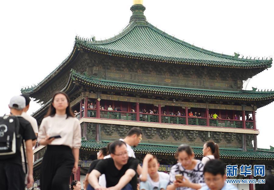 7月19日,游客在西安钟楼上游览。暑期以来,西安市各大旅游景点人气火爆。大量游客前来游览历史文化景区,品尝传统特色美食,感受千年古都厚重与时尚交融的独特魅力。新华社记者邵瑞摄