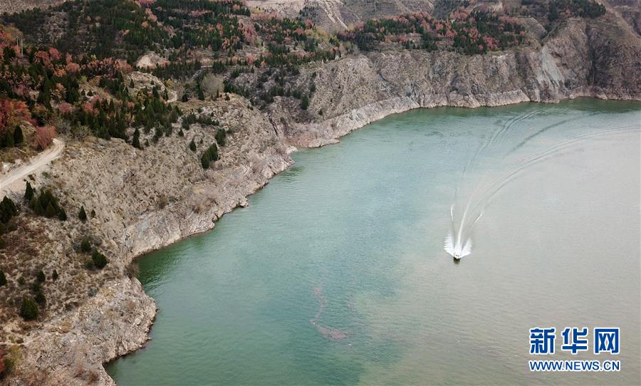 10月24日,一艘快艇从刘家峡水库库区驶过(无人机拍摄)。 新华社记者 陈斌 摄