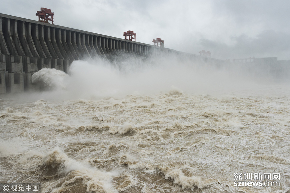 2018年7月5日,湖北宜昌,江水通过三峡大坝泄洪深孔下泄。