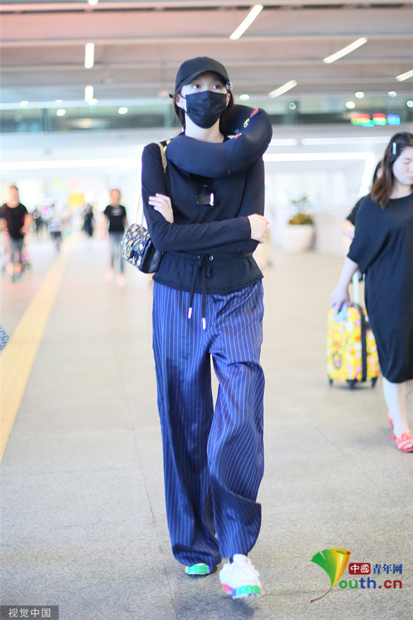 关晓彤淡定抱臂行走 脖子上挂U型枕毫无偶像包袱