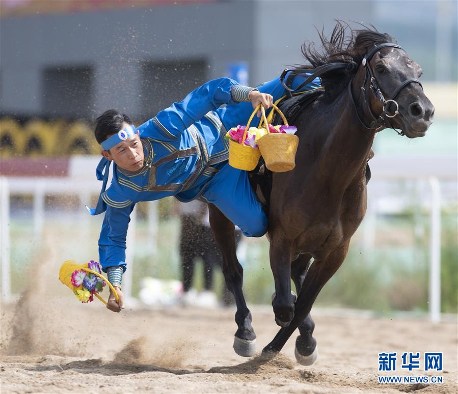 7月15日,内蒙古代表团选手表演马上技巧。当日,在内蒙古呼和浩特市举办的第十一届全国少数民族传统体育运动会马上项目进入第四个比赛日。新华社记者沙达提摄