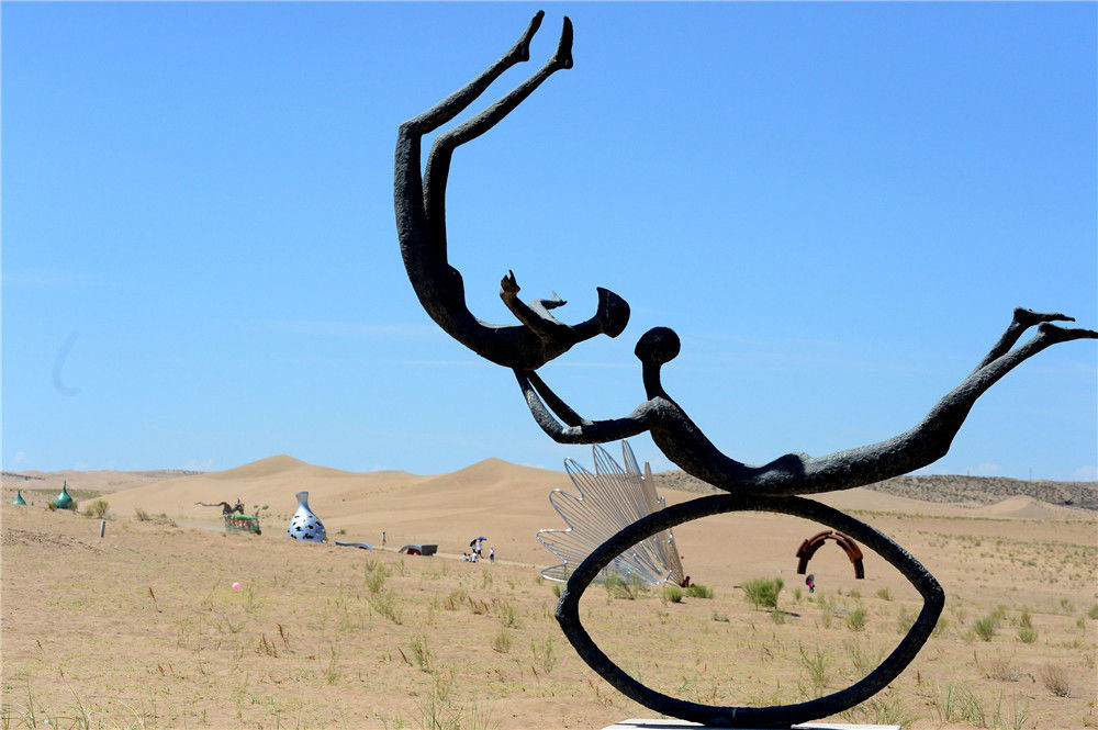 2019年7月20日,甘肃武威,72座造型各异的雕塑与茫茫大漠完美融合。2019中国·民勤第二届沙漠雕塑国际创作营暨大地艺术节在武威市民勤县开幕,72座造型各异的雕塑与茫茫大漠完美融合,吸引众多游客前来“打卡”。裴强/视觉中国