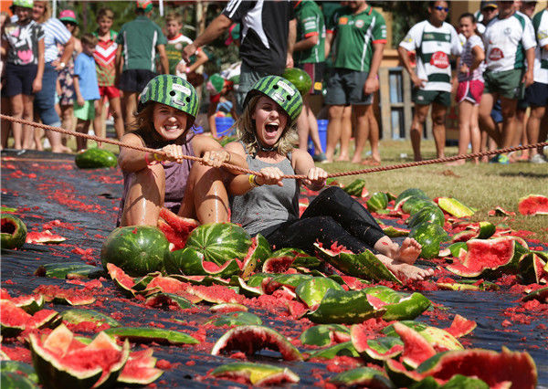 当地时间2015年2月14号,澳大利亚昆士兰州内陆小镇金吉拉举办“西瓜节”,疯狂搞笑的滑西瓜比赛让人度过有趣难忘的节日,参赛者将双脚插入新鲜的西瓜中,然后从斜坡上滑下去。摔倒即被淘汰,可是想不被摔倒也很难。今年这一节日正好与情人节相遇,所以更增添了甜蜜味道。刚刚过去的周末共有10,000多名游客涌入金吉拉镇,使用了总重月20吨的优质西瓜,体验这项极富创意的滑西瓜活动。