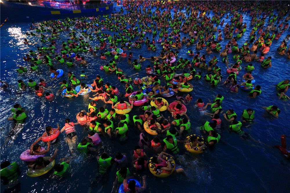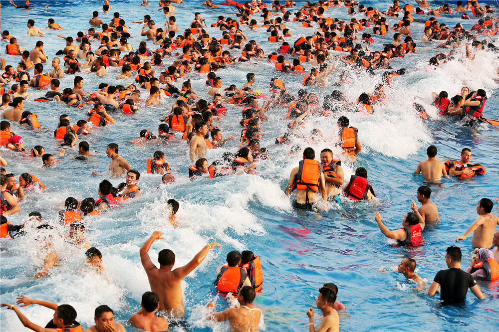 2018年7月20日,郑州乐海水世界,众多市民扎堆下水避暑享清凉,场面壮观如下饺子。中原第二大闲人/视觉中国