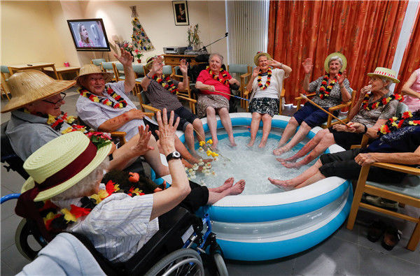 当地时间2018年8月3日,比利时赫林贝亨,几位老年人一起泡脚消暑。