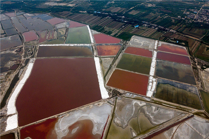 2019年7月3日,山西省运城市,无人机航拍色彩斑斓的盐湖。
