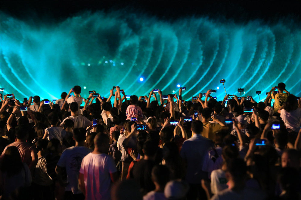 2019年7月7日晚,位于杭州湖滨三公园的西湖音乐喷泉吸引了不少游客前来观赏。浙报传媒/视觉中国