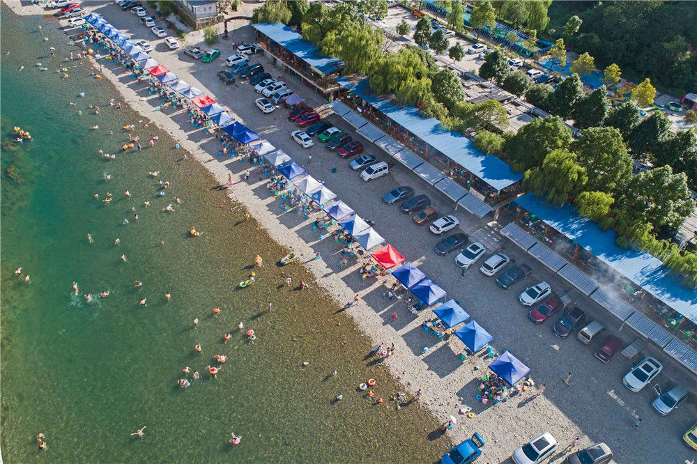 2018年7月29日,市民在贵州凯里市三棵树镇境内的巴拉河里游泳避暑。(航拍)陈沛亮/视觉中国