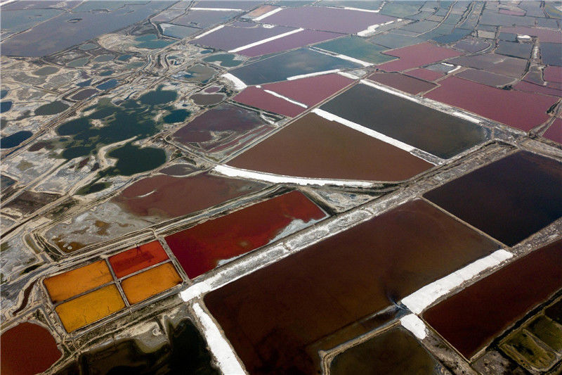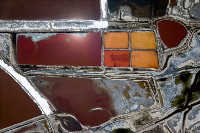 2019年7月3日,山西省运城市,无人机航拍色彩斑斓的盐湖。入夏以来,随着气温不断攀升,位于山西省南部的运城盐湖浓度升高,呈现出色彩斑斓景观,从空中俯瞰犹如天然“调色盘”,成为当地夏日一道独特风景。韦亮(山西分社)/中新社/视觉中国 编辑/陈进