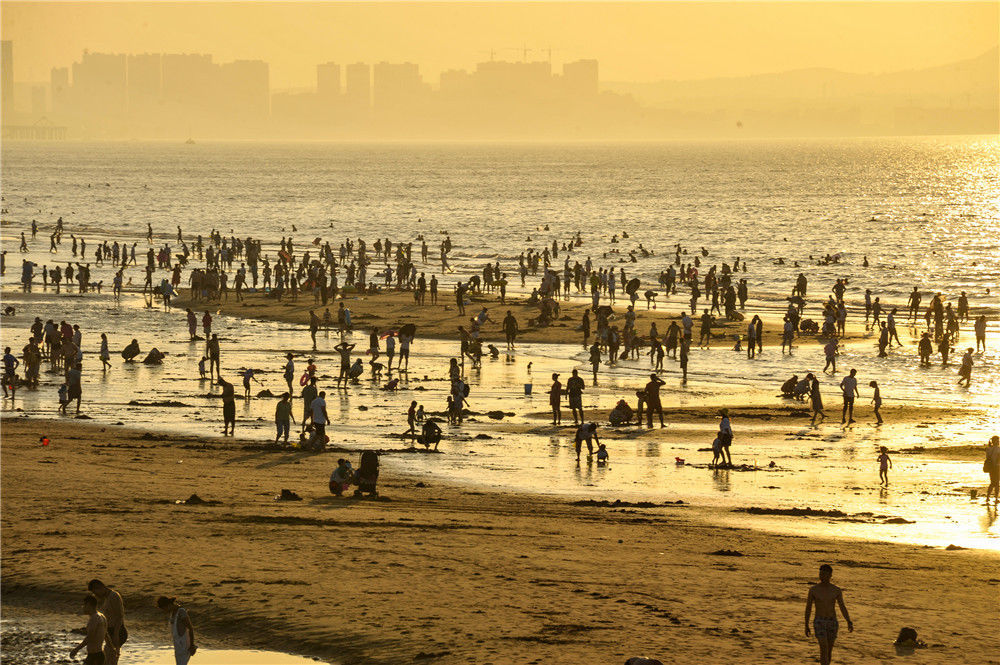 2019年7月21日,山东烟台,高温天气来袭,金沙滩海滨浴场人流如织,游客在海边戏水纳凉。张卫国/视觉中国