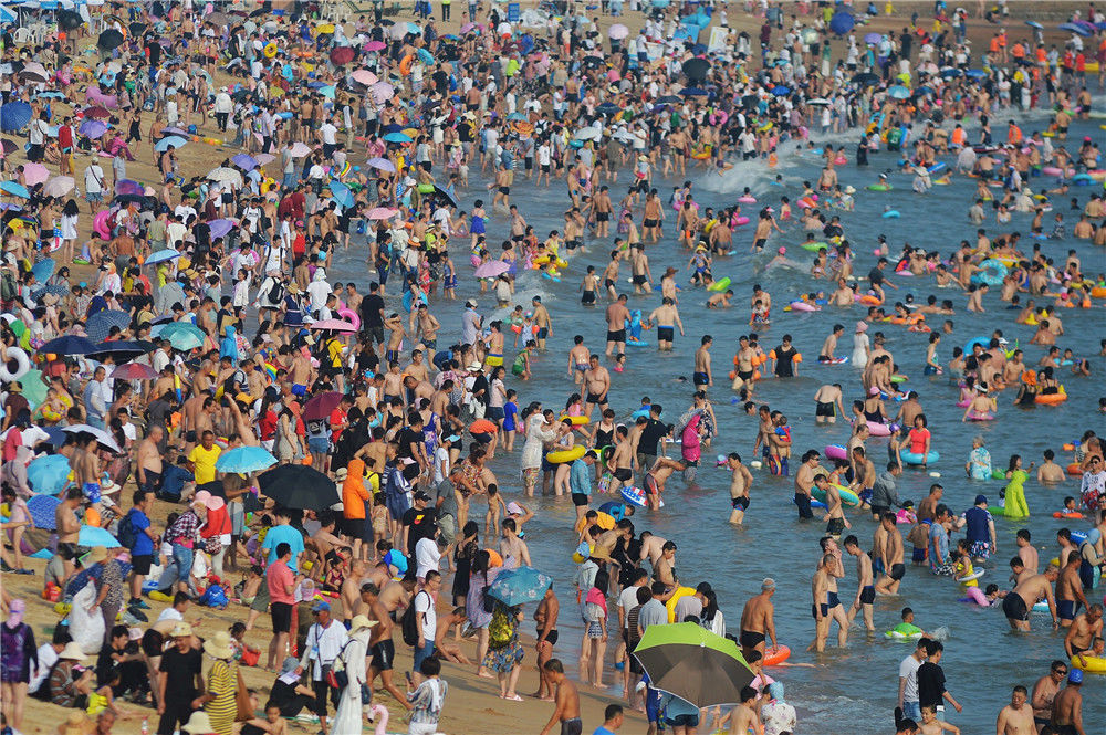 2019年7月21日,山东青岛开启“烧烤模式”,众多游客来到海边戏水纳凉,第一海水浴场游客爆满。王海滨/视觉中国