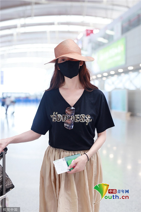 2019年7月23日,上海,林志玲现身机场,穿着打扮与三天前在台北机场相比毫无变化,依旧身穿黑体恤搭配米色休闲裤,墨镜也依旧挂在胸前。