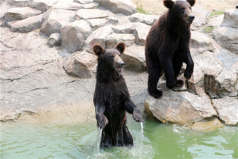 2019年7月23日,在江苏南通森林野生动物园,狮子、东北虎、河马等在水中戏水降温,享受水中惬意清凉。