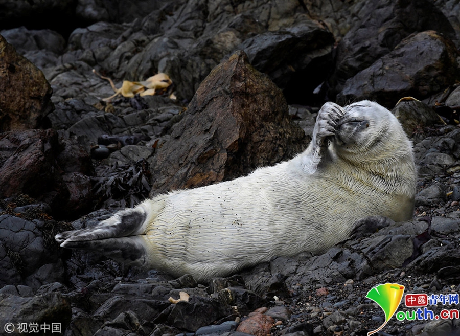 一只大西洋海豹幼崽躺在海边礁石上,镜头前害羞遮脸。