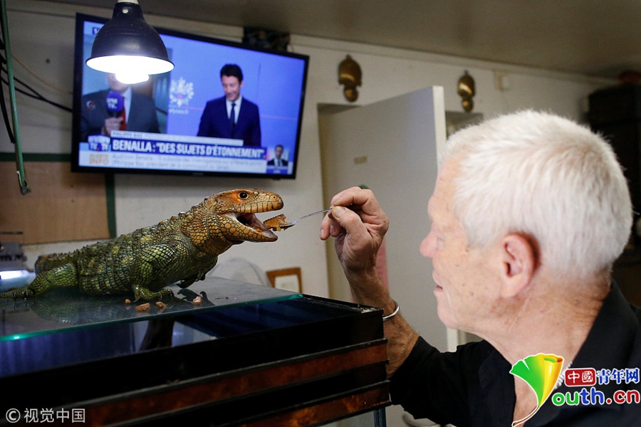 用小汤匙喂蜥蜴。尽管Philippe Gillet的这些宠物看起来对他并无伤害,但是家里有400多只爬行动物遍布角落的感觉是什么样,请自行体会。