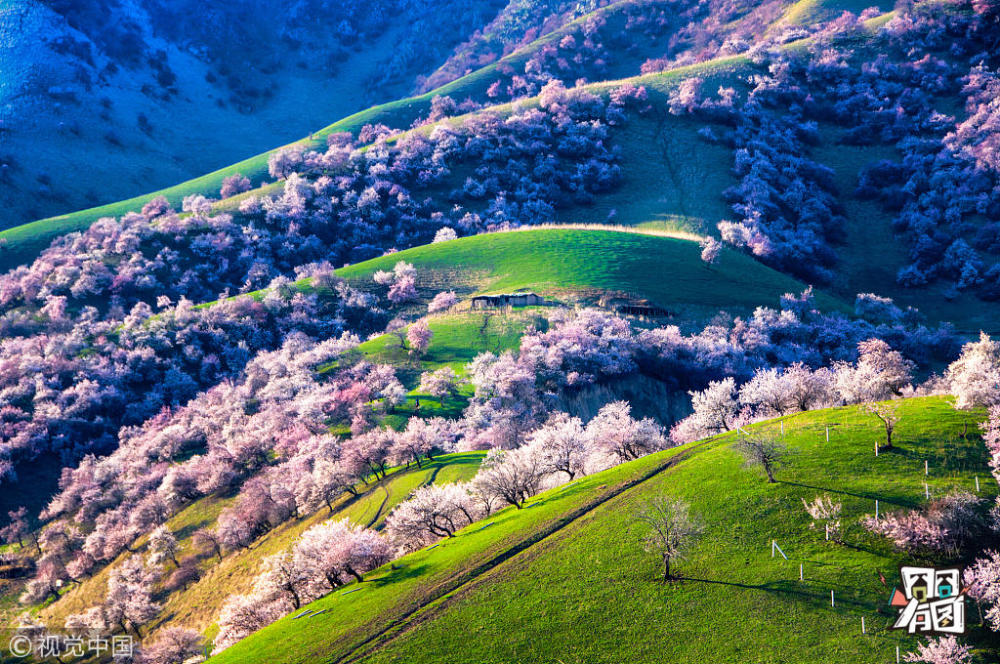 【新疆杏花沟中世纪原始野杏林】新疆杏花沟,位于新疆伊犁新源县吐尔根乡,这是一片中世纪遗留最大的原始野杏林,集中分布于巩乃斯河北岸,占地有3万多亩,绵延十几公里。这里,曾被评为“人生中不得不去的100个地方”。进入四月,灿若云霞的杏花如期而至,花开漫山,微风拂过便下了一场杏花雨,呈现出“杏花枝上着春风,十里烟村一色红”美景。随着阳光射入角度的变化会呈现出不同的美景。