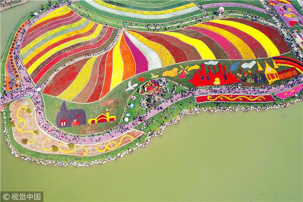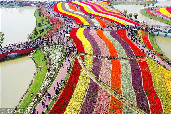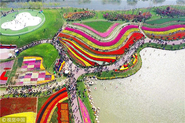 2019年4月6日,江苏盐城市大丰荷兰花海的300万株郁金香随风盛开,吸引了众多市民和游客前来观赏。从空中看,一片片彩色的郁金香花田仿佛巨幅彩带,将数百亩花海装扮得分外美丽。杨素平/视觉中国