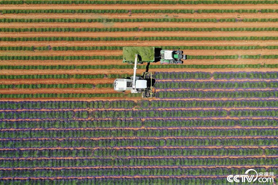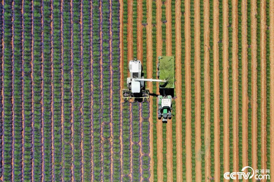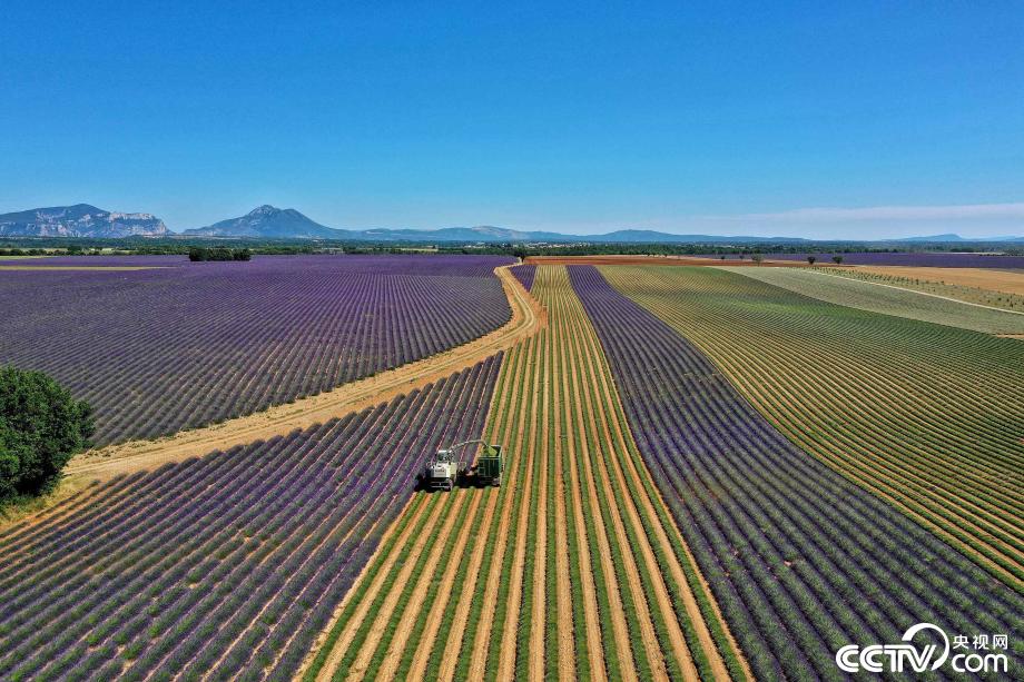 央视网消息2019年7月24日消息(具体拍摄时间不详):法国瓦朗索勒高原,当地农民采用农业机械收割数百英亩用来制造精油的薰衣草,场面壮观。图片来源:视觉中国