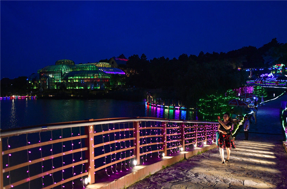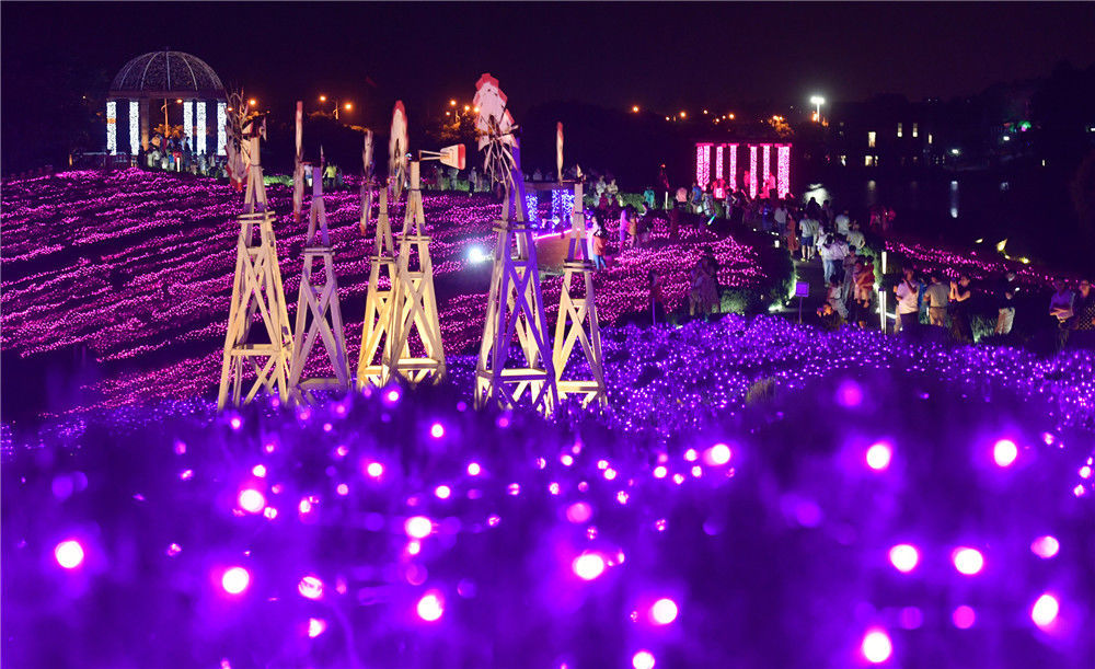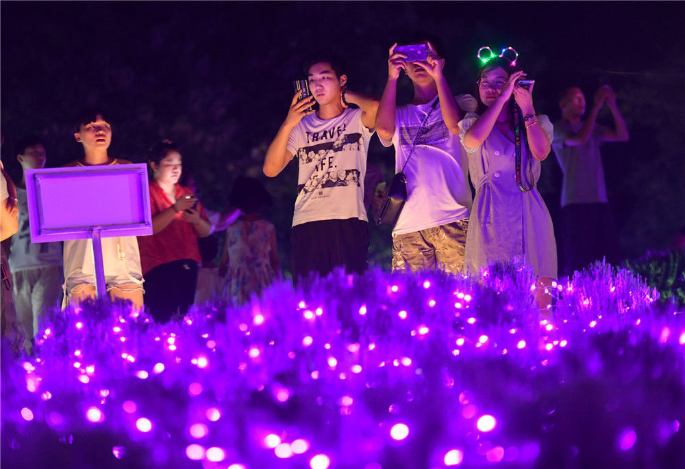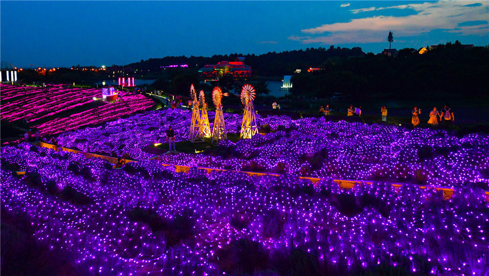 2019年7月16日,南京谷里大塘金薰衣草庄园内,数百万个LED灯覆盖在花海之上,形成薰衣草灯海,让游客体验一场视觉盛宴。