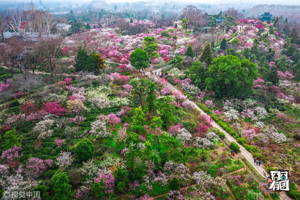 【江苏南京梅花山中国最大梅园】南京梅花山,有“天下第一梅山”之誉,与上海淀山湖梅园、无锡梅园和武汉东湖梅园并称中国四大梅园,居四大梅园之首。南京梅花山植梅面积达1533亩,梅树3万5千余株,品种多达367种,其中国际登录品种137个。进入三月,由于雨水充沛,温度适宜,南京梅花山迎来盛花期,花团锦簇引游人。