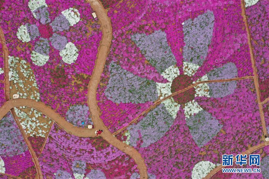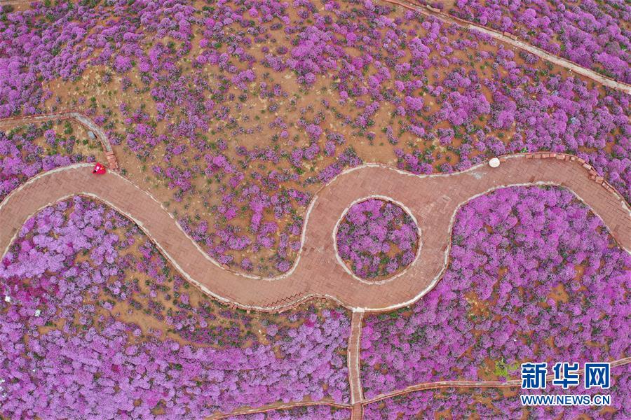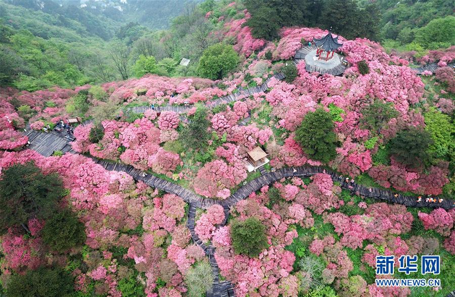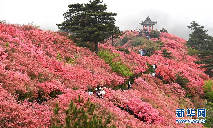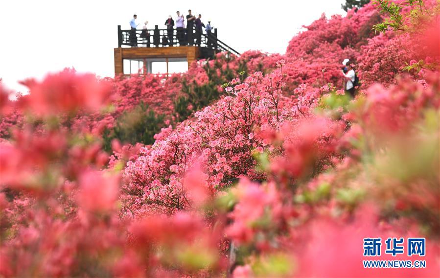 4月25日,游客在龟峰山杜鹃花海中游玩。 近日,湖北省麻城市龟峰山的10万亩古杜鹃盛开,大量游客前来赏花观景。 新华社记者 程敏 摄