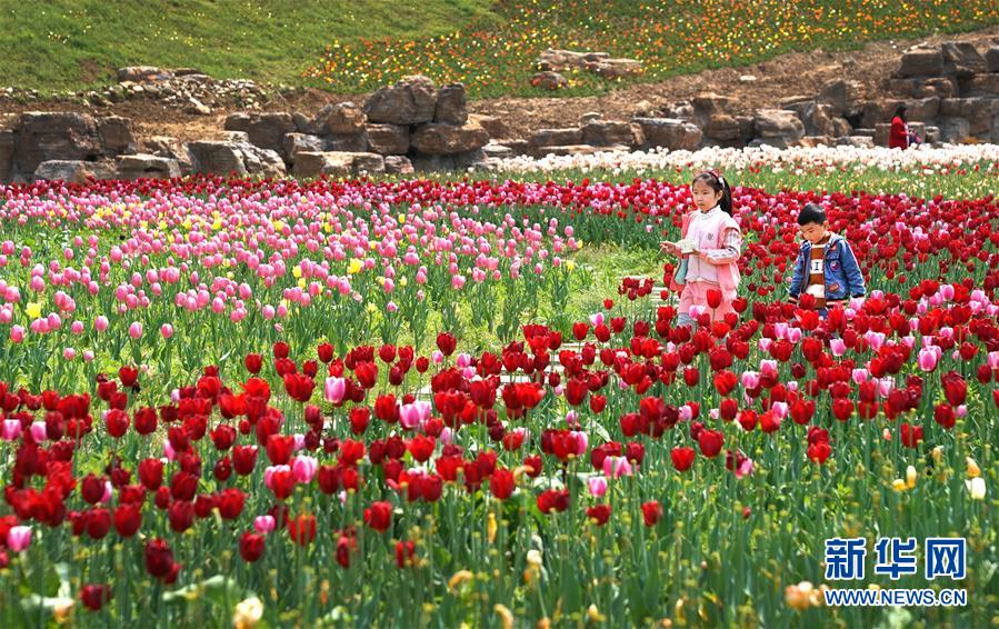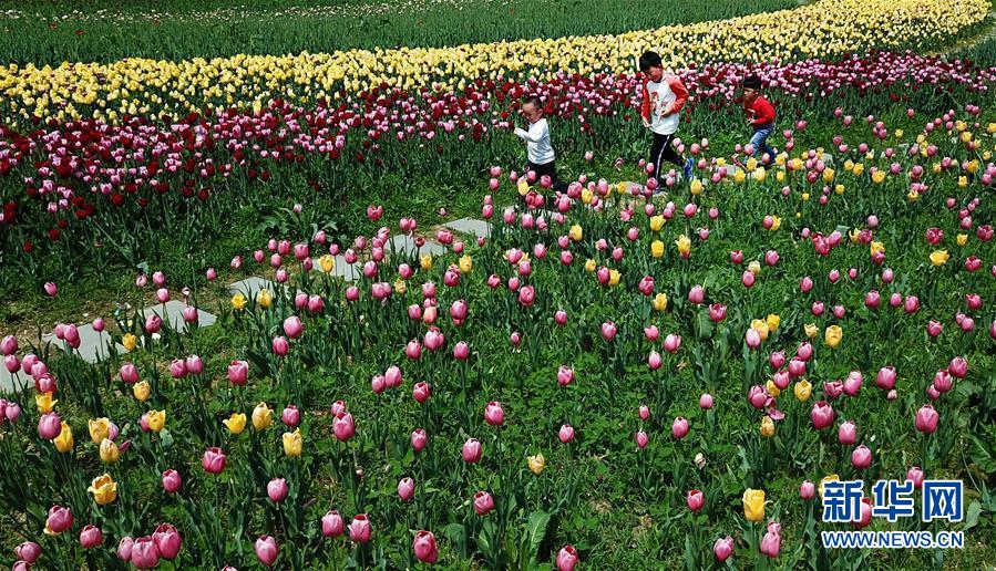 4月14日,游客在位于湖北省十堰市茅箭区的秦巴生态植物园内游玩。近日,位于湖北省十堰市茅箭区的秦巴生态植物园内,200万株郁金香竞相开放,吸引游客前来赏花游览。 新华社记者 程敏 摄