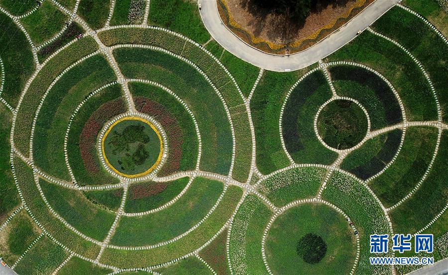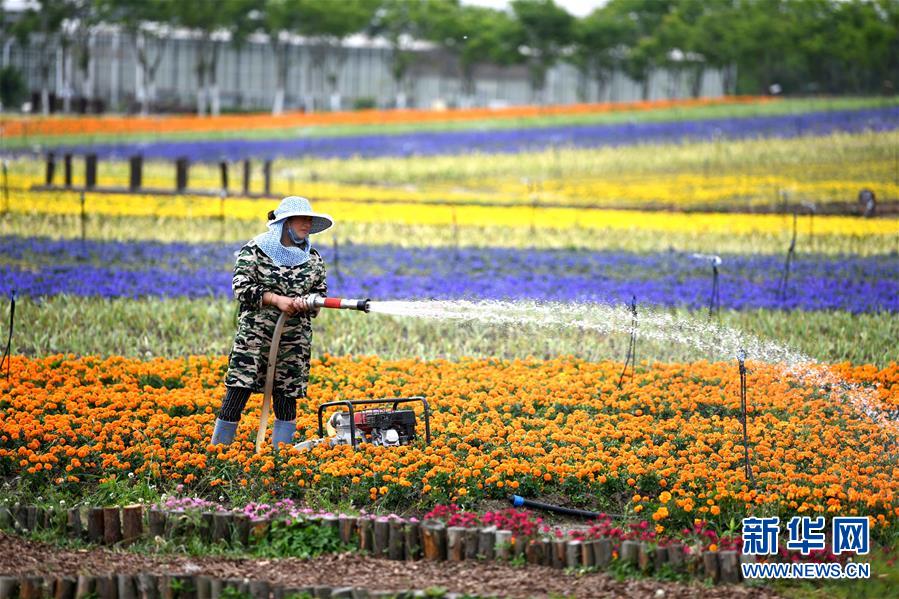 5月9日,包河区牛角大圩四季花海工作人员为花草浇水。 近年来,安徽省合肥市包河区深度挖掘生态休闲旅游资源,结合美丽乡村建设,对村域旅游资源、生态环境、基础设施等进行优化提升,吸引游客前来赏景度假。 新华社记者 刘军喜 摄