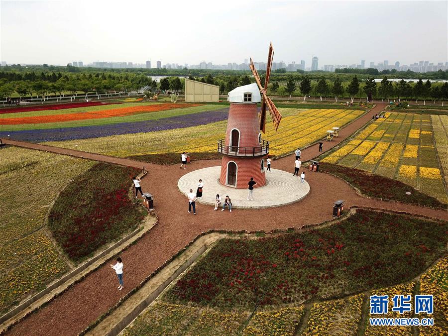 游客在包河区牛角大圩四季花海游览(5月9日无人机拍摄)。 近年来,安徽省合肥市包河区深度挖掘生态休闲旅游资源,结合美丽乡村建设,对村域旅游资源、生态环境、基础设施等进行优化提升,吸引游客前来赏景度假。 新华社记者 刘军喜 摄