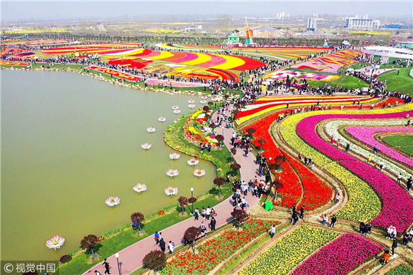 2019年4月6日,江苏盐城,大丰荷兰花海景区,人们在赏花游玩,尽享春光。