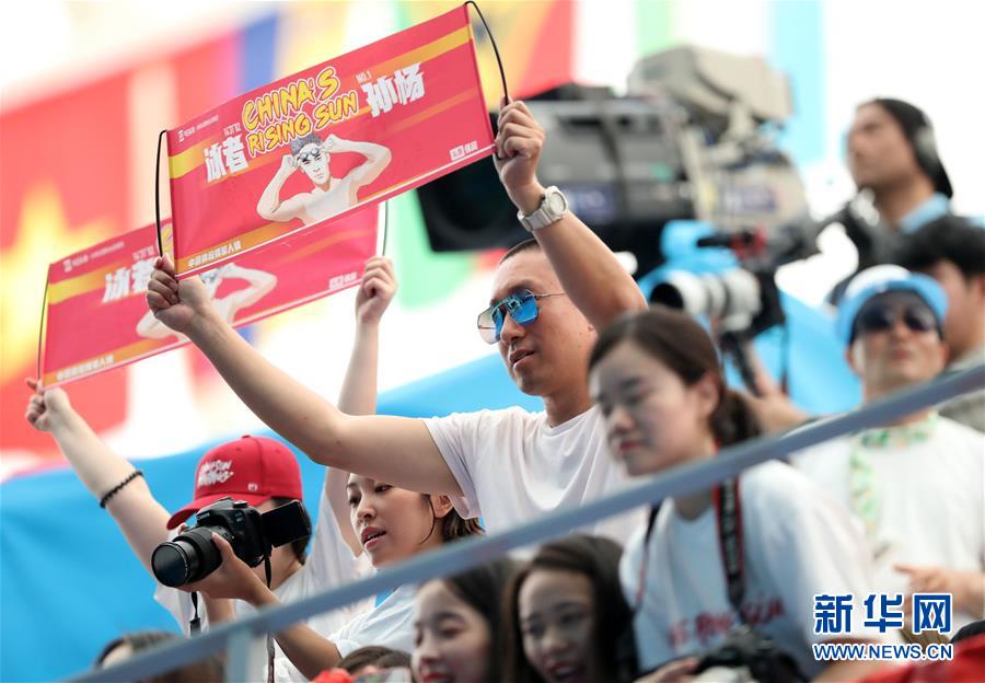 7月22日,孙杨的支持者在比赛现场为他加油。当日,在韩国光州举行的2019国际泳联游泳世锦赛男子200米自由泳预赛中,中国选手孙杨以1分46秒22的成绩获得预赛第二名,晋级半决赛。新华社记者李钢摄