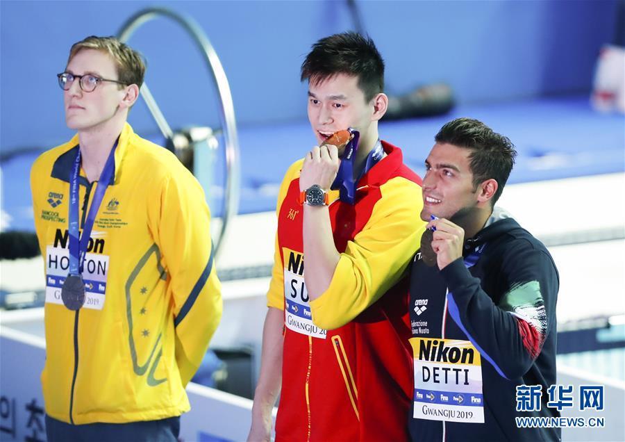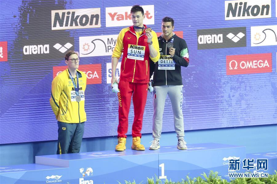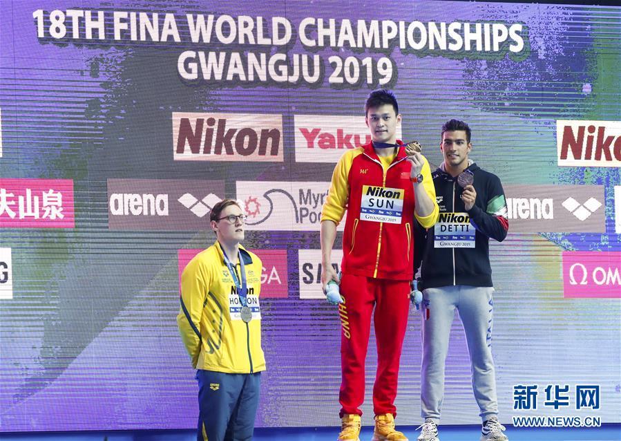 7月23日,孙杨在颁奖仪式上。当日,在韩国光州举行的2019国际泳联世界游泳锦标赛男子200米自由泳决赛中,中国选手孙杨以1分44秒93的成绩获得冠军。新华社记者夏一方摄
